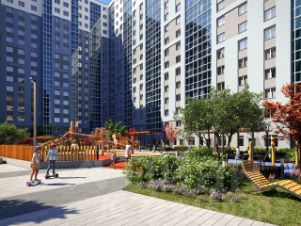 На территории комплекса будет выполнено благоустройство, размещены детские и спортивные площадки, а также зоны отдыха для жителей дома. Доступ в жилую часть разработан с учетом потребностей маломобильных групп населения.