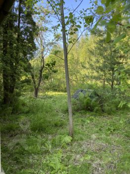 Участок с хорошей землёй, зелёный. Растут три ели (одна из них голубая), туй, сосна, сирень, жасмин, открытую веранду закрывает девичий виноград. Растут плодовые деревья и кустарники: яблони, смородина, крыжовник и черная рябина.