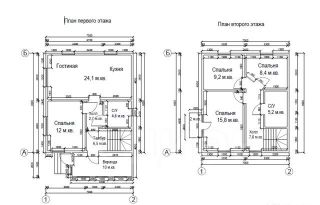 На первом этаже расположена кухня-гостиная 24.1 кв.м, спальня 12 кв.м, санузел, холл и веранда 10 кв.м; на втором комнаты 15.8 кв. м, 9.2 кв. м, 8.4 кв. м., холл, санузел, а также лестница на мансарду.