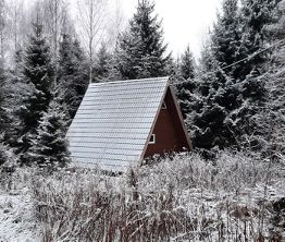 На участке построен треугольный дом A-frame. Проводка разведена внутри стен, фасад крашеный планкен из лиственницы, крыша- металлочерепица, утепление 150мм, внутри- имитация бруса. Остаётся только выбрать цвет стен, декоративно обшить окна и поставить сан.узел.