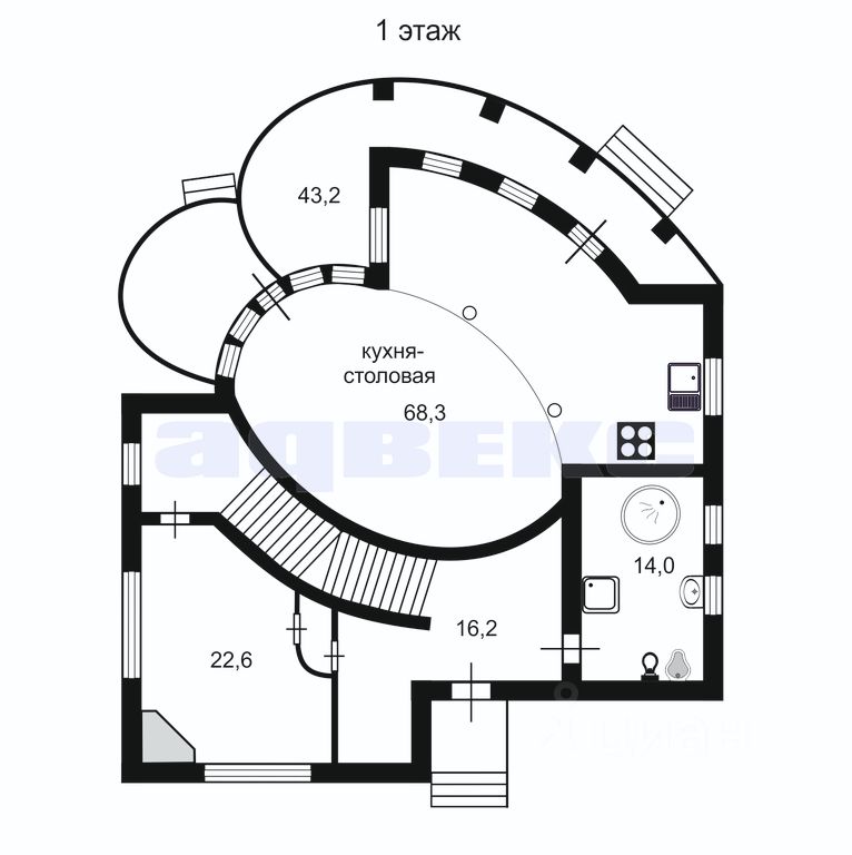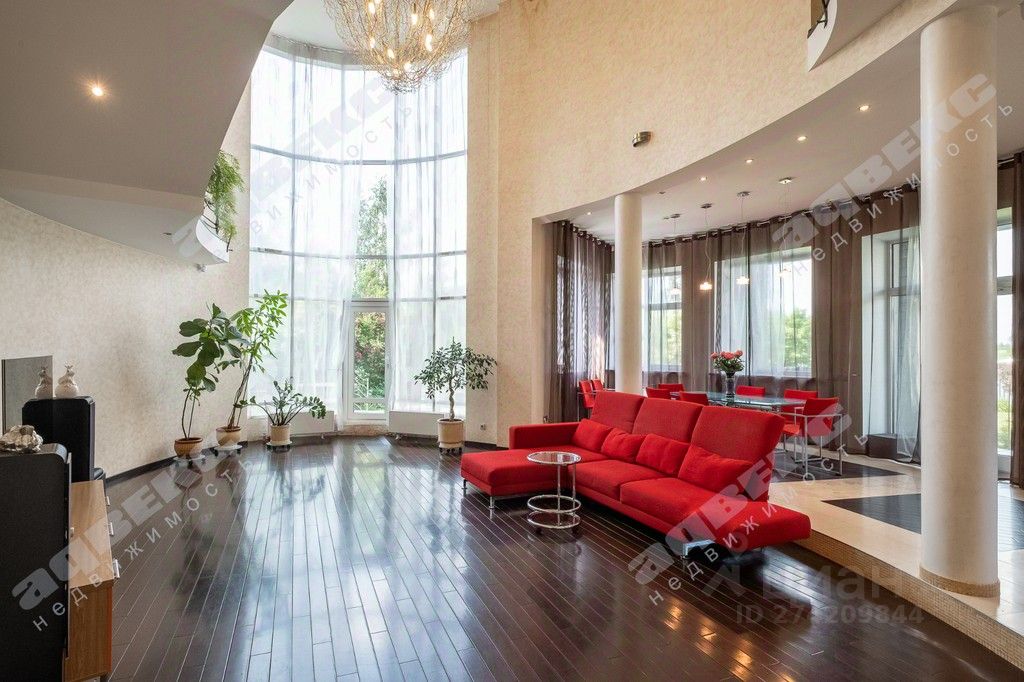 На первом этаже расположена просторная кухня-гостиная, высота помещения более шести метров. Круговая лестница ведет в жилую зону, где на разных уровнях расположены шесть отдельных комнат, в каждой из которых есть свой санузел.