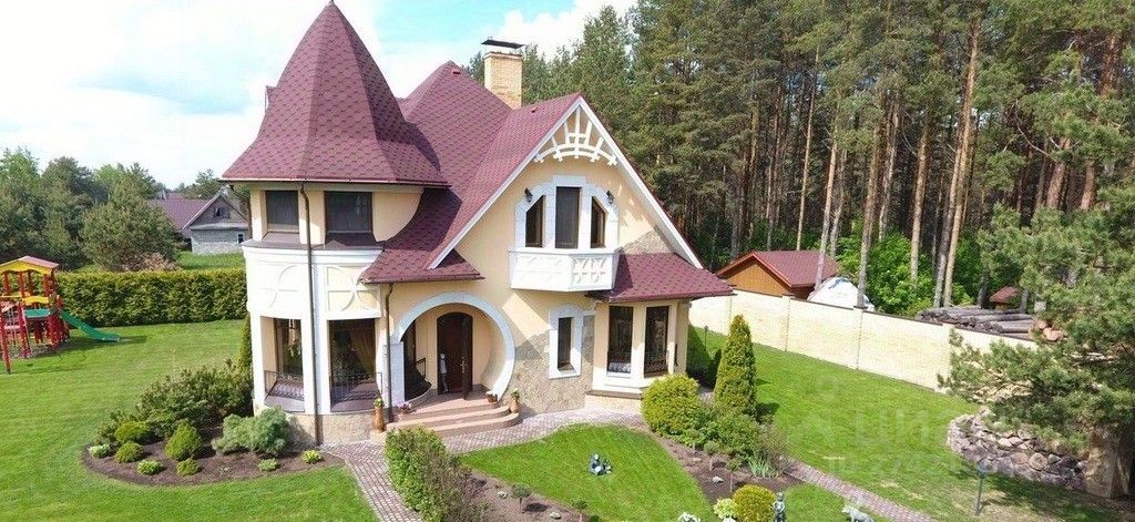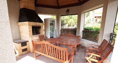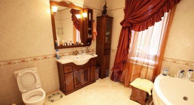 Основной дом построен из кирпича (фасад декоративная штукатурка) площадью 350 м. кв. На первом этаже которого расположенная большая гостиная со вторым светом, столовая и кухня со встроенной дорогостоящей мебелью.