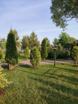 Участок обустроен: тротуарная плитка зелёные насаждения(более 100 деревьев), детская площадка, фанарное освещение