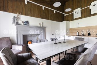 1 этаж: просторная кухня, гостиная с камином, отделанным ониксом, изолированная спальня, санузел, гардеробная, выход на закрытую террасу.