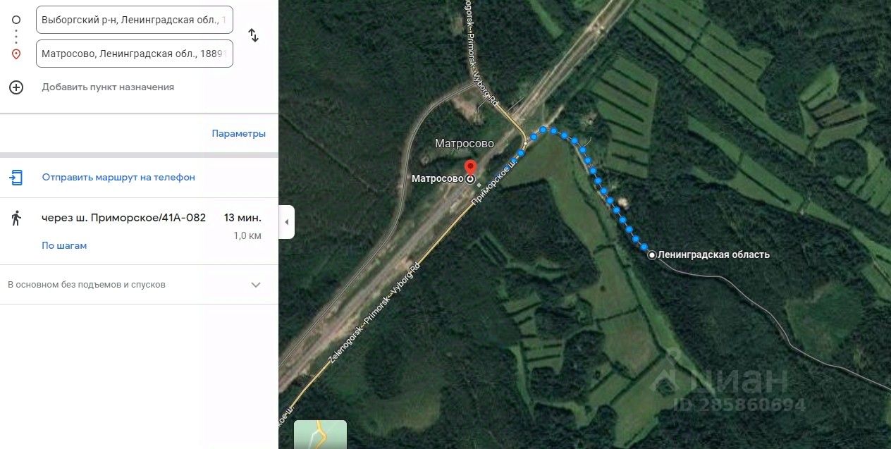 Участок находится в 10 км от Выборга, в 15 минутах пешком находится ж/д станция Матросово.
