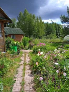 Есть грядки с клубникой ,овощными и декоративными посадками.