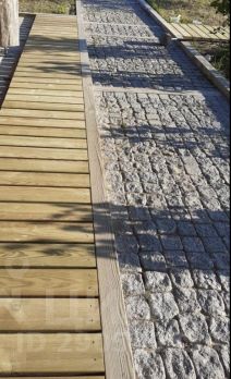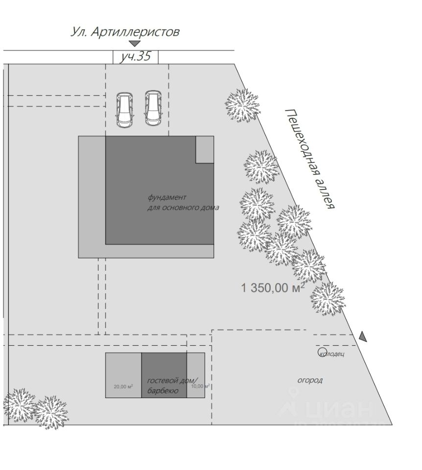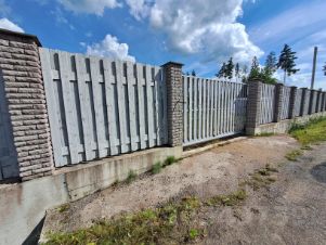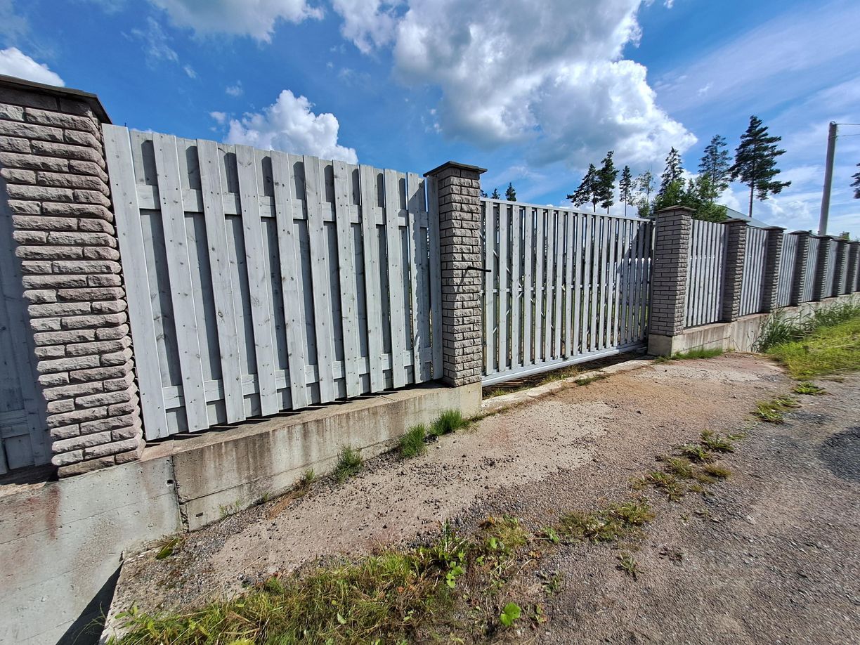 Въезд с откатными воротами, отдельная калитка на пешеходную дорожку. Участок разработан, отсыпан, высажены крупномерные ели, сосны, газон. Забор по трем сторонам, деревянный на бетонном фундаменте, четвертая сторона- временное ограждение, рабица. Огород, садовые деревья. Коммуникации: централизованное водоснабжение, центральная канализация, электричество. Имеется колодец, для полива огорода. Магистральный газ- по границе участка.