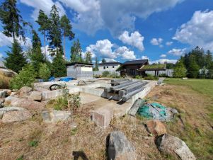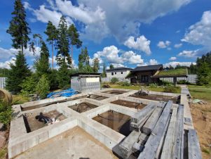 2. Фундамент для основного дома 12х12м, фундаментная плита, коммуникации (вода, канализация) заложены.