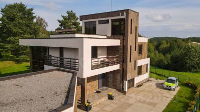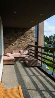 - Продуманная планировка дома: большая кухня-гостиная; мастер-спальня; 2 детские спальни; комната отдыха, гостевая спальня, домик охраны; 4 санузла.