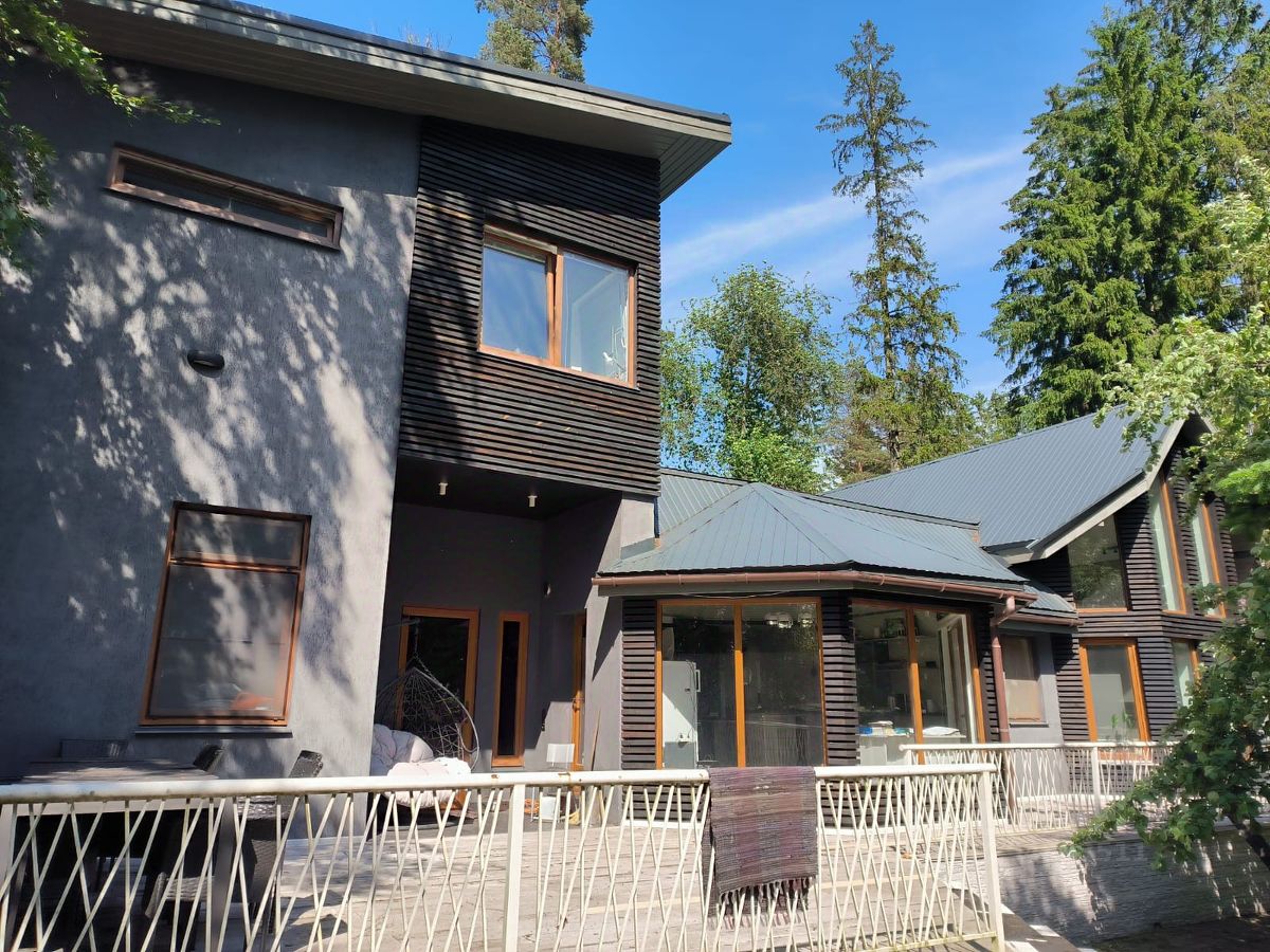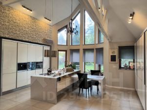 Просторная гостиная со вторым светом и панорамным остеклением, пять мастер-спален (свой с\у и гардеробная), две прачечные, кухня, выход на террасу и веранду.