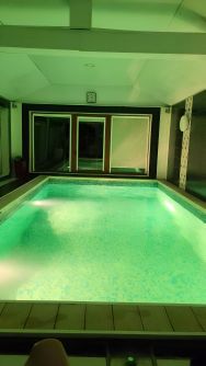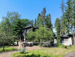 Так же в комплекс входит баня на 112м2. В этом строении имеется крытый бассейн (чаша 7х4м) с круговым остеклением, дровяная финская сауна, гостевая комната с балконом, котельная и сан.узел - есть все для круглогодичного проживания.