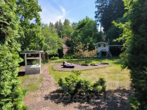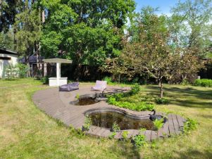 Участок высокий и сухой с ландшафтным дизайном, на территории сделана полифитрация не требует откачки ограда с откатными воротами, имеет мощение, искусственный пруд, барбекю с навесом, игровая площадка с домиком, макет мельницы, гараж и навес - въезд высотой 6м и площадью 30м2. Оборудован дизельный генератор.