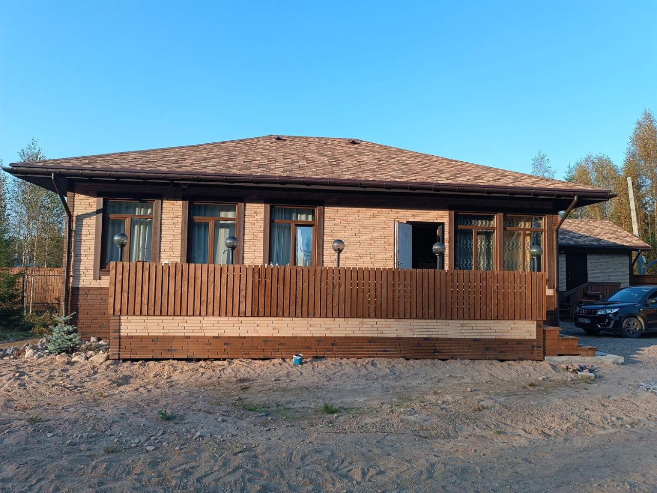 Дом строился для себя из материалов высшего качества. Дом эксклюзивный, подобных по качеству строительства, домов, предлагаемых к продаже, практически невозможно найти на рынке. Дом состоит из двух комнат, площадью по 14 кв.м каждая, зимней теплой верандой (13 кв.м), прихожей (9кв.м), санузлом (8кв.м), парной(сауной) (7 кв.м), котельной (4.5 кв.м), кухней-гостиной (32 кв.м), высота потолка 2.8 м; терраса 8х2.5м.