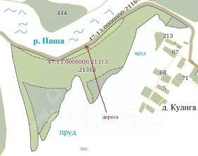 Участок 19.7 га через дорогу от реки Паша. Сельскохозяйственные земли для сельскохозяйственного производства. В виду близости реки, есть частично водоохранная зона, есть и площади без обременений. По границам есть ещё пруды (на одной из фото). Пруды, реку и дорогу видно хорошо на кадастре и спутнике. Рядом деревня Кулига. Дорога чистится т. К. Она ведет в деревню, состояние её хорошее. Участок почищен от березок.