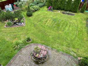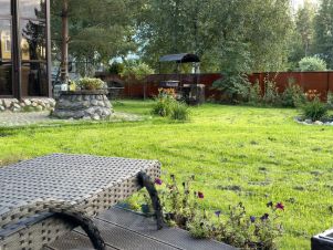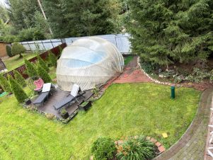 Участок 8 соток сухой, высокий, ровный. Сделан ландшафтный дизайн и дренаж. На участке: бассейн с подогревом, фильтрацией и подсветкой; место под шашлык/барбекю; теплица; парковка на 4 машины; автоматические откатные ворота; брусчатка вокруг дома и на парковке. С одной стороны периметра участка живая изгородь из елок и сосен, с другой - изгородь из туй. На участке вырыт пруд с нимфеями, посажены плодово-ягодные и декоративные кусты, деревья и растения, есть зона для высадки садовых и овощных культур.