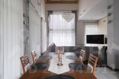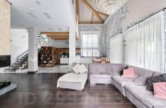 Он впечатляет не только выверенными дизайнерскими решениями, но и высотой потолков до 8 м и большим количеством окон, благодаря которым дом наполняется естественным светом.
