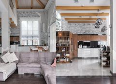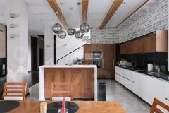 В планировке воплощены популярные тренды: просторная кухня-гостиная более 70 кв.м с камином, кухня и обеденная зона как для тихих семейных завтраков, так и для шумных званых ужинов.