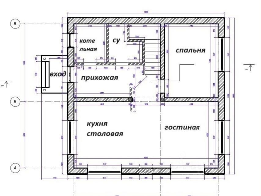 Первый этаж - гостиная объединенная со столовой с выходом на террасу, спальня, тех.помещения.