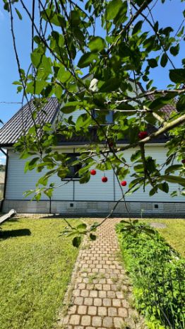 На участке ростёт несколько яблонь с изумительно вкусными яблоками, несколько вишен, слива и груша, а так же малина и несколько кустов голубики.