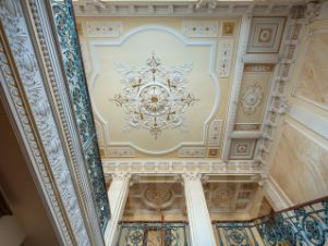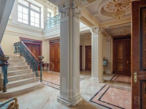 В парадную часть дома ведут двери, инкрустированые тонким узором из ценных и пород дерева. Перед вами открывается великолепный парадный холл с торжественной мраморной лестницей.