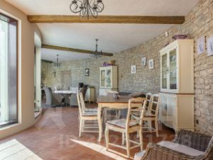 За спа-комплексом расположилась пристройка-павильон для отдыха. Это галерея с внушительной печью-барбекю, с полностью оснащенной кухней и столовой, декорированное в стиле прованс: кованые светильники, пол из натурального камня. Павильон со стеклянным фасадом, обращенным в сад, оборудован теплым полом и теплоэффективными стеклопакетами. Летом широкие двери распахиваются в сад, и вся комната становится зеленой гостиной.
