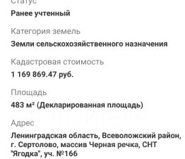 СНТ Ягодка. Массив Черная речка, ул. Ключевая, участок 166. Кадастровый номер 47:08:0104004:18 Земли населённых пунктов . Для ведения садоводства.