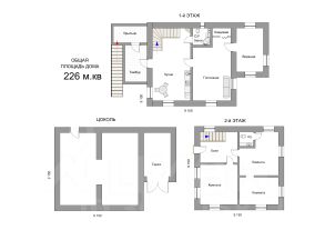 - Площадь 226 метров. Дом 2-х этажный + цокольный этаж + гараж (24м.) + чердак(34м.)+ веранда (24м.) Высота помещений на 1-м и 2-м этажах - 2,7 метров, высота помещений в цокольном этаже 1,8 м.