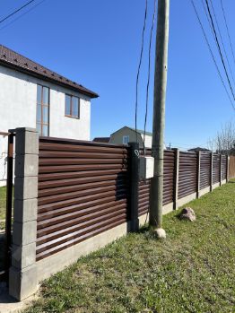 Дом из газобетона 235 ,5 м2, который стоит на железобетонной плите 12,5м * 12,5 м, на участке 12 соток. Участок огорожен забором с откатными воротами на въезде.