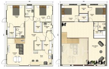 На втором этаже 2 спальни с гардеробными, ванная, сауна и большой холл для совместного проведения времени в кругу семьи. К внешнему фасаду дома примыкают две террасы.