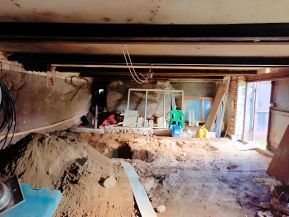 В двух комнатах стоят две огромный бетонные ванны неизвестного назначения. Так же есть заложенный кладкой подземный ход на соседний участок, очень интересный)).