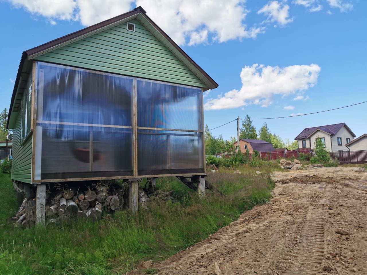Есть бытовка. В ней пусто. Там можно сделать летний СУ или в ней будут жить строители Вашего дома мечты.