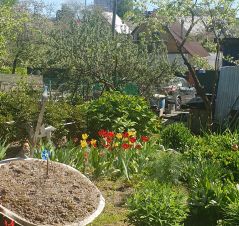 На участке: декоративные и плодовые деревья и кусты, цветы, грядки (земля плодородная)