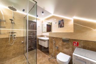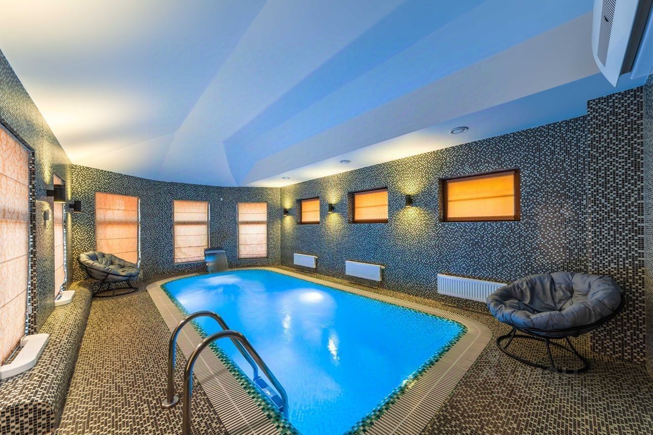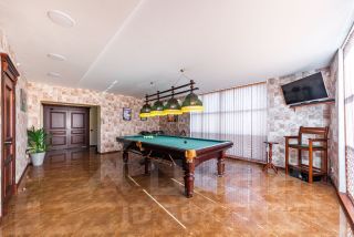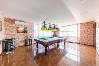 1 этаж — бильярдная зона, одна спальня, просторная кухня-гостиная с камином и спа-комплекс, сауна, хамам, тёплый бассейн (о 0 до 40 градусов) с гидромассажем, противотоком и водопадом, душевая и туалет.