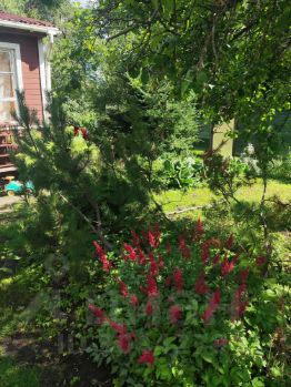 Центральное водоснабжение. На участке расположены два дома. Один дом 1968 года постройки, включает в себя небольшую прихожую, веранду, три спальни на первом этаже, одну спальню и кладовки на втором этаже. Вода в этот дом не заведена. В доме печь голландка - отапливает две комнаты, требует ремонт или под снос, и строить свой дом. Второй дом 2016 года постройки, 5,5*6 м, одноэтажный, в доме веранда, комната, кухня, туалет (торфяной биотуалет), душ, вода заведена в дом, горячая и холодная (установлен бойлер), дом отапливается печью. Подключена газовая плита, газ привозной в баллонах, так же есть электрическая плитка. На участке красивые сосны, ели, каштан, плодоносящие яблони, черная смородина, крыжовник, малина, вишня, слива. Грядок нет, посажены цветы - розы, пионы, лилии и др. Много свободного и открытого пространства. Напротив участка колонка с питьевой водой, работает по индивидуальному ключу, вода наичестейшая - каждый год берут пробы на проверку. В СНТ ведется круглосуточное видеонаблюдение, зимой дороги чистят, мусор регулярно вывозят.