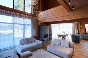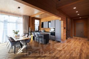 На первом этаже дома расположены просторная гостиная со вторым светом и дровяным камином переходящая в зону кухни-столовой с отдельным выходом на летнюю террасу.