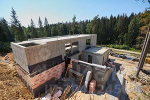 Фундамент дома - монолитная железобетонная теплоизолированная плита (марка бетона В30) с заложенными коммуникациями, контуром заземления, дренажной системой и каналами для прокладки кабелей освещения прилегающей к дому территории. Прозрачные стены первого и второго этажей выполнены из двухкамерных стеклопакетов, заполненных аргоном в алюминиевых рамах. Внутреннее стекло закаленное, селективное, центральное F-стекло, внешнее закаленное, солнцезащитное. Глухие стены сделаны из газобетона толщиной 400 мм. Крыша монолитная с наплавляемой кровлей.