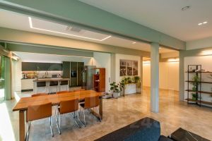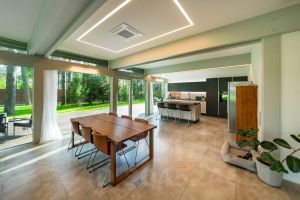 Дом окружен террасой общей площадью более 125 кв. метров из натуральной древесины. В доме три спальни, кухня-гостиная, две гардеробные, четыре санузла, большая кухонная кладовка, постирочная и хозяйственная комната, кабинет на первом этаже.