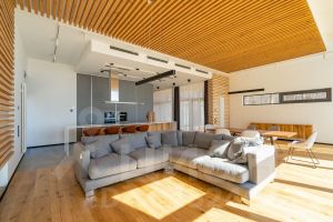 Основной дом общей площадью 295,2 кв. м. Дом построен по авторскому проекту. Перепад высот на участке доходит до 3,5 м, поэтому архитектор придумал расположить основной дом в верхней части участка, а гостевой (150 кв. м) на ступень ниже.