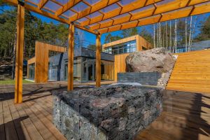 Основной дом одноуровневый, поделен на приватную и общую зоны, большую часть последней занимает объединенная с кухней гостиная. Из нее открывается панорамный вид на залив, и отсюда же есть выход на террасу, где летом приятно поваляться на шезлонгах. Помимо просторной кухонно-гостевой зоны (80 кв. м) в основном доме есть три спальни, мастер-ванная, гардеробная, гостевой с/у. Терраса одновременно является крышей гостевого дома. Из его гостиной тоже открывается вид на Финский залив, а также на огромный валун, который был на участке. Камень вписали в стену здания, укрепив с помощью массивного основания. Гостевой дом состоит из кухни-гостиной, спальни, с/у, комнаты отдыха, просторной террасы и крытой беседки.
