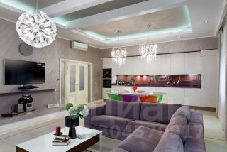 Потолки во всех помещениях многоуровневый окрашенный гипсокартон с элементами подсветки светодиодными лентами.