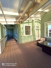 Дом и баня расположены в одну линию, что позволило соединить их большой открытой террасой с кровлей, что заменяет собой беседку и является прекрасным местом отдыха.