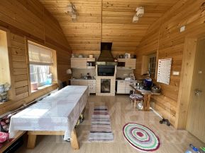 На первом просторная кухня-зона барбекю с вытяжкой (готовить на углях можно в любую холодную погоду в доме). Гостиная с раскладным диваном, мини кухня. Санузел, душ, стиральная машинка.