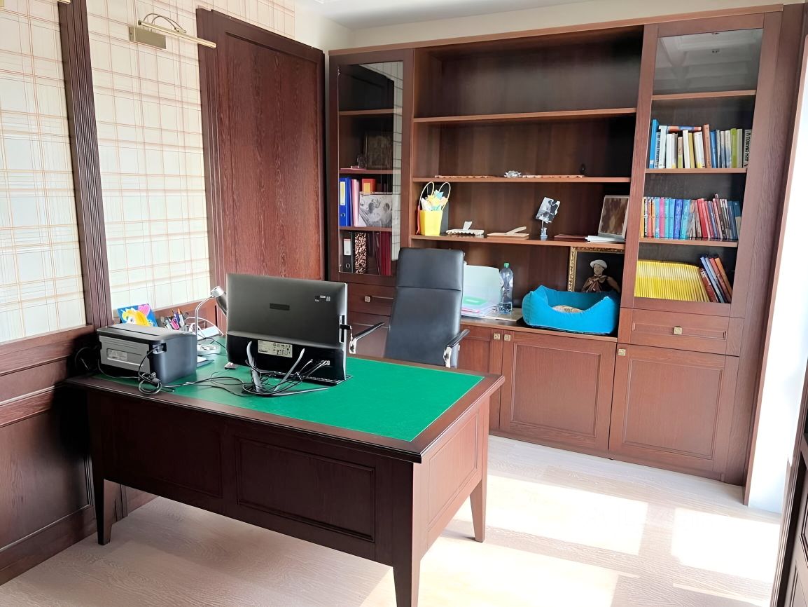 На втором этаже располагаются: большая спальня с отдельным санузлом, душевой кабинкой и гардеробной, есть выход на балкон; две детские комнаты-спальни; гостевая; второй санузел с душевой кабинкой; рабочий кабинет с оружейным сейфом, также есть выход на балкон.