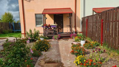 Участок угловой, выход на терассу со стороны гостиной, солнечный в течение всего дня, с утра солнце со стороны кухни и спальни, после обеда со стороны гостиной и детской. На участке крытая парковка на два автомобиля, электрические подъёмные ворота, детская площадка с двумя качелями и горкой, просторная терасса 12 м3, уличные качели.