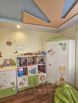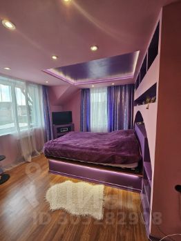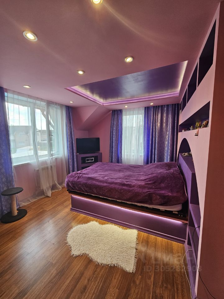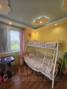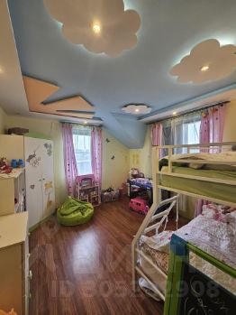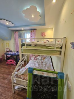 На втором этаже в спальне и и детской так же дизайнерское освещение. Вход в гардеробную со стороны спальни. В детской двухъярусная кровать, шкаф, комод, на окна установлены блэк-аут шторы.