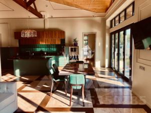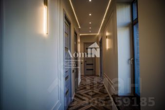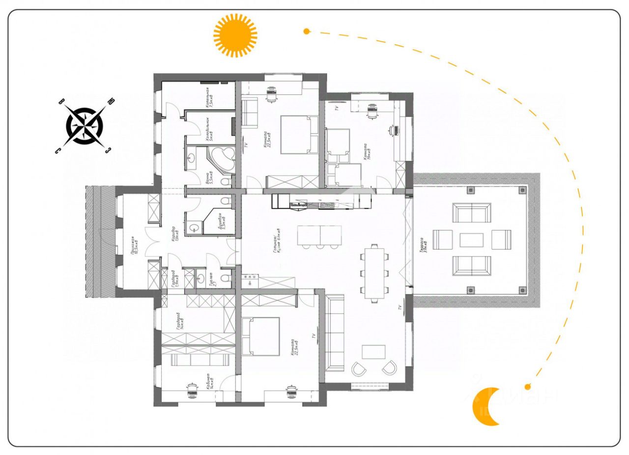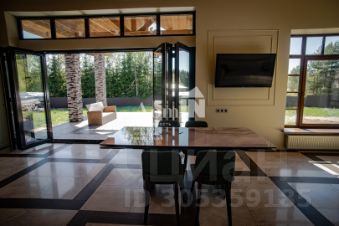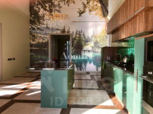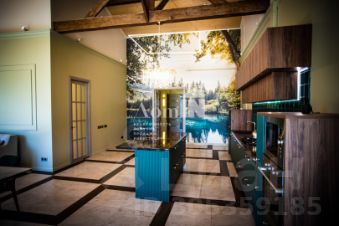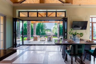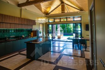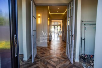 - просторная кухня-гостиная со вторым светом и выходом на террасу через портальную дверь (4,2 м), кухонный гарнитур со встроенной техникой - 5 м по стене плюс островная часть 2х1 м с местом для барных стульев, обеденный стол 2.6 м, мягкая мебель RООМА dеsign & furniturе. Терраса - 36 кв.м. меблирована плетеной мебелью. Три большие комнаты (по 22 м с нишами под встроенные шкафы, кабинет 14 кв.м, большая комната-гардеробная с окном и отдельными встроенными нишами под обувь, комната-холодильник 7 кв.м., три санузла (ванная, душевая, гостевой) с немецкой сантехникой НаnsGrоhе, инсталляциями ТЕСЕ, мебелью, зеркалами.
