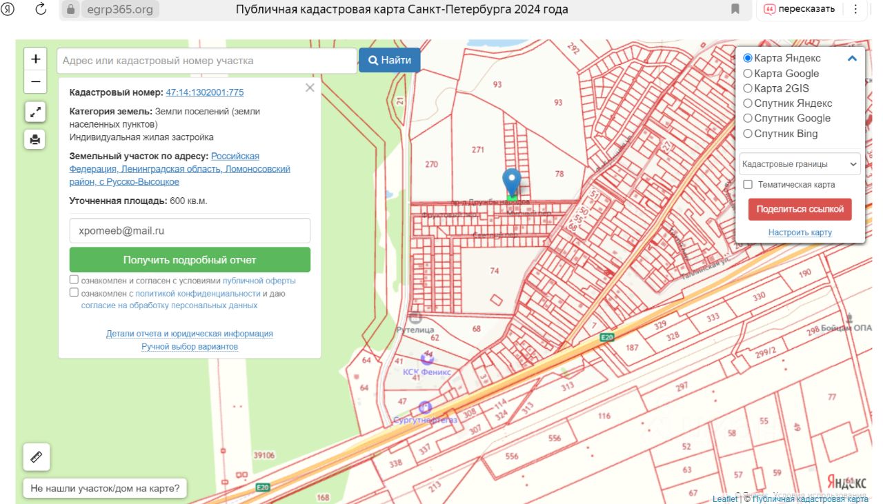 Участок, кадастровый номер 47:14:1302001:775 площадью 6 соток, имеет правильную форму, он сухой и ровный. К участку подведено электричество, а также имеется возможность подключения к газовой магистрали. Чистая питьевая вода на глубине от 18-20м, скважины делают от 20 до 30м