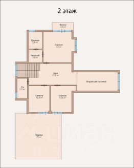 2 этаж, площадь - 86 м2, включает: 3 спальни: 21 м2 с душевой - 12,5 м2, 13 м2 и 14,2 с выходом на террасу 48 м2, ванную комнату - 5,4 м2, холл - 21 м2, балкон - 4 м2;