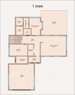 1 этаж, площадь - 130 м2, включает: просторную кухню-гостиную - 40 м2 с выходом на террасу, кабинет - 16 м2, комнату отдыха - 16,5 м2, гардеробную -3 м2, душевую - 5,5 м2, холл с лестницей - 21 м2, прихожую - 4 м2, хозяйственные помещения: постирочную - 3,7 м2, кладовую -6,7 м2 и котельную - 5,4 м2;