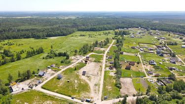 В поселке проложены подъездные и внутренние дороги. По границе поселка и участков растут березы и хвойные деревья.